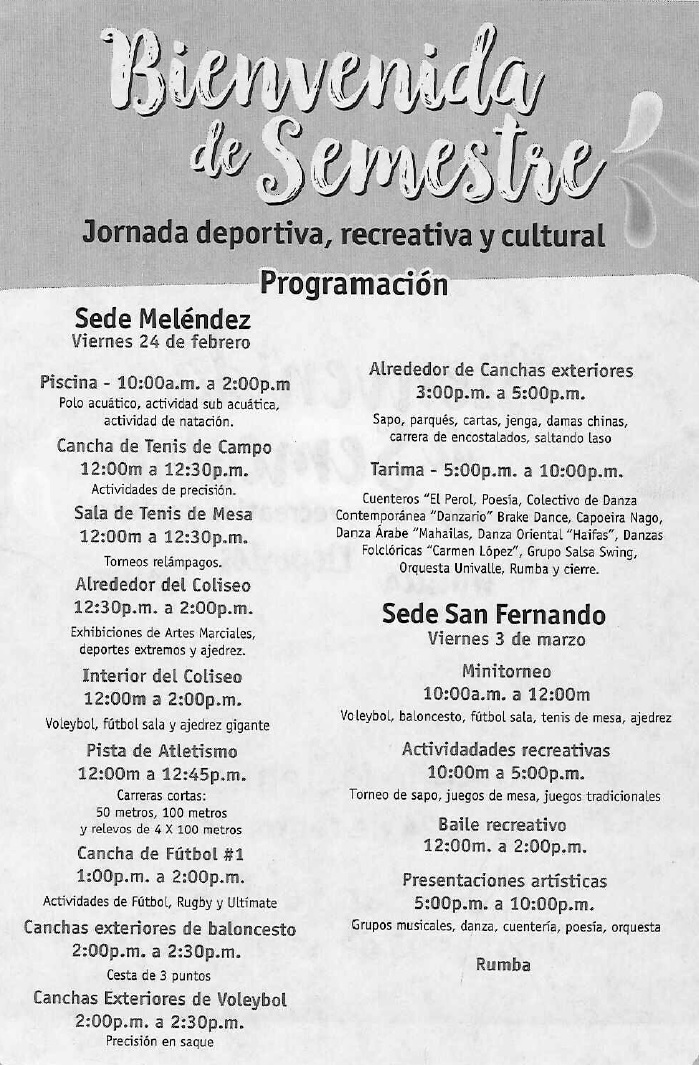 Actividades de natación, torneos deportivos relámpagos, cuenteros, poesía, baile y música hacen parte de la programación de la Bienvenida de Semestre que realiza la Vicerrectoría de Bienestar Universitario de la Universidad del Valle.