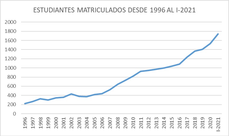 Gráfica de estudiantes matriculados en pregrado desde el año 1996 al 2021