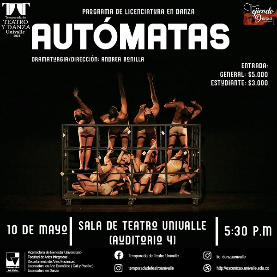 La temporada de Teatro y Danza Univalle I-2023 invita a presenciar una creación dancística que busca representar la transformación de la humanidad en seres autómatas, con aforo ilimitado de público. Una obra escrita y realizada en la asignatura Taller de Creación I, por el grupo de estudiantes de VII semestre de la Licenciatura en Danza, y dirigida por la docente Andrea Bonilla.