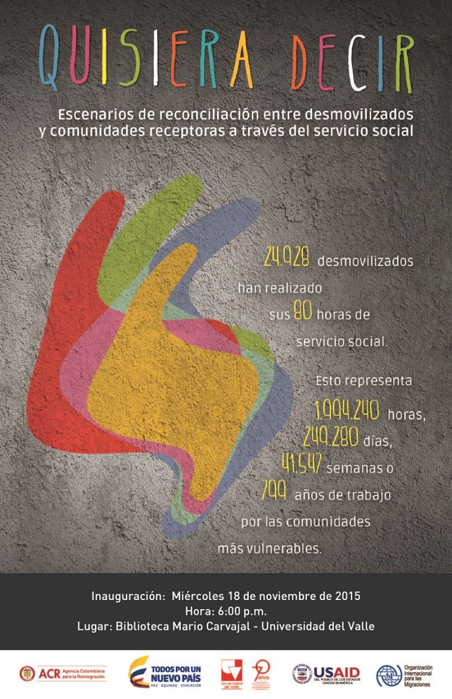 Desde este miércoles 18 de noviembre la Biblioteca Mario Carvajal de la Universidad del Valle alojará la exposición “Quisiera Decir, escenarios de reconciliación entre desmovilizados y comunidades receptoras a través del servicio social”.