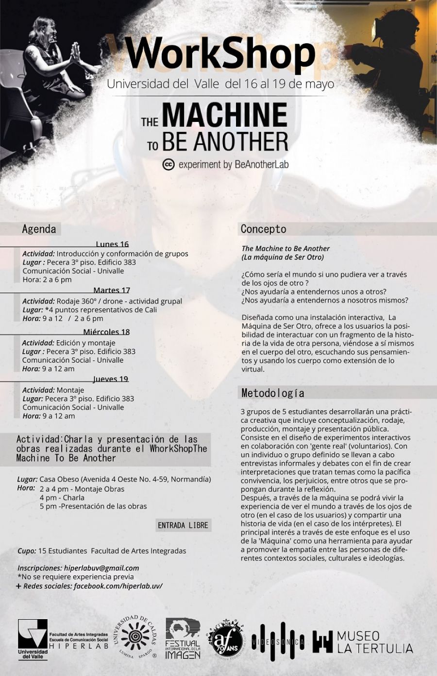 El jueves 19 de mayo a las 4:00 p.m se presentará en la Casa Obeso la instalación de “La máquina de ser otro”, titulada en inglés “The Machine To Be Another”, junto a las obras resultantes de estudiantes de la Facultad de Artes Integradas de la Universidad del Valle que participan en un taller homónimo, entre el 16 y el 19 de mayo de 2016.