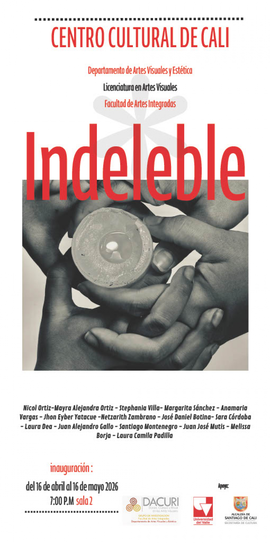 El Departamento de Artes Visuales y Estética de la Universidad del Valle invita a la apertura de la exposición ‘Indeleble’, que se realizará este jueves 16 de abril, a partir de las 7:00 p.m., en la Sala 2 del Centro Cultural de Cali.