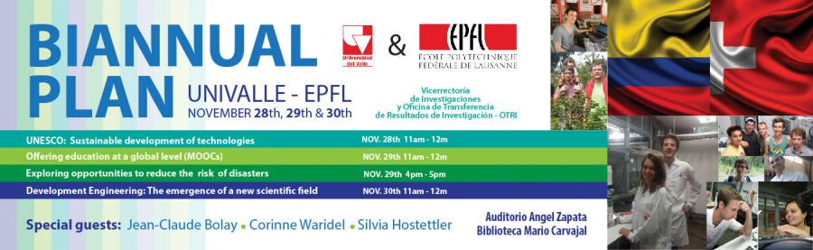 Mañana miércoles 30 de noviembre de 2016, en el marco del plan Bianual de cooperación Universidad del Valle - Escuela Politécnica Federal de Laussana (EPFL) 2016, se dictará la conferencia "Development Engineering: The emergence of a new scientific field", organizada por la Vicerrectoría de Investigaciones y la Oficina de Transferencia de Resultados de Investigación de la Universidad del Valle.