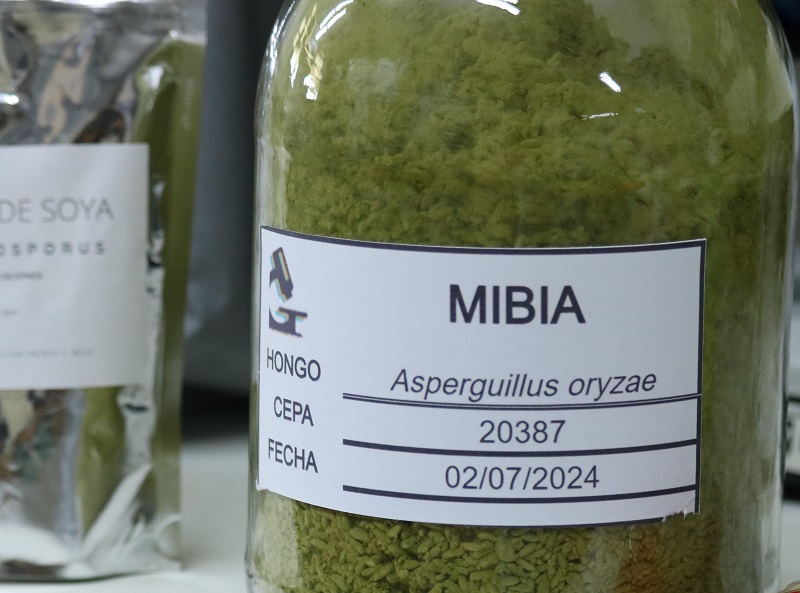 En el laboratorio MIBIA existe un lugar especial para la preservación de microorganismos como bacterias, levaduras y hongos: el cepario. En este espacio, equipado con estanterías y refrigeradores para almacenar muestras, Yineth Sofía, investigadora e ingeniera de alimentos, selecciona tres cepas de hongos fundamentales para la producción de las proteínas vegetales: Aspergillus oryzae u hongo Koji, Rhizopus oryzae y Rhizopus oligosporus. Estos hongos filamentosos, considerados GRAS o de consumo seguro para la alimentación humana, son cultivados o inoculados siguiendo el método Tane-Koji, el cual consiste en inocular sustratos o materiales sólidos como el arroz o la soya con las esporas de los hongos.