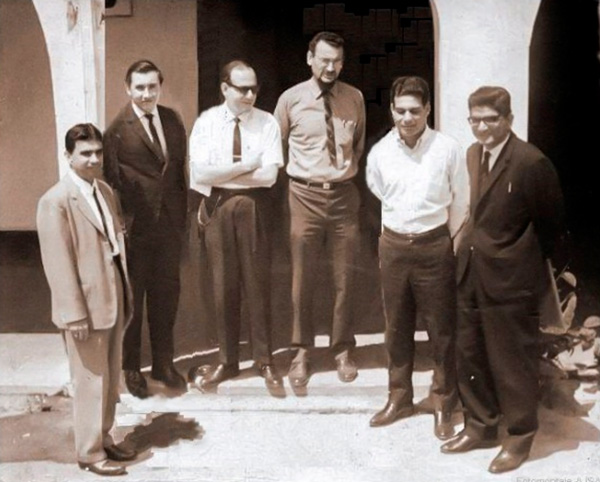 Departamento de Física. Fundadores. De izquierda a derecha (del lector): Hernando Guerrero, Carlos Díaz, Ramiro Tobón, Michel Valero, Enrique Castellanos y Edmundo Gutiérrez
