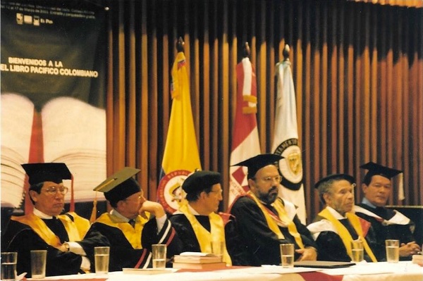 Ceremonia de entrega en junio de 2003 del doctorado Honoris Causa en Literatura al escritor Manuel Zapata Olivella. De izquierda a derecha: Ivan Ramos (vicerrector académico), Óscar Rojas(rector), Darío Henao (Decano Humanidades), Manuel Zapata Olivella y el escritor Óscar Collazos