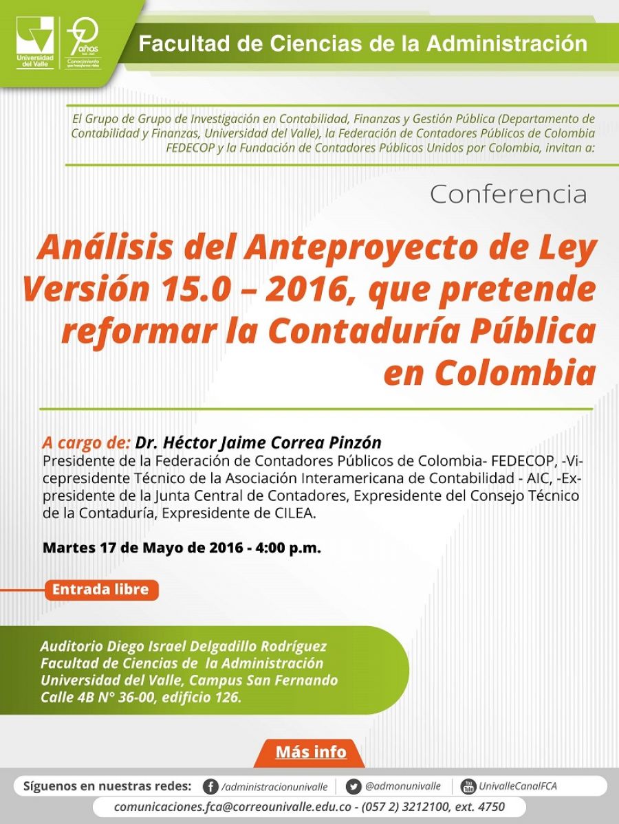 El Programa Académico de Contaduría Pública de la Facultad de Ciencias de la Administración de la Universidad del Valle, a través del Grupo de Investigación en Contabilidad, Finanzas y Gestión Pública, la Federación de Contadores Públicos de Colombia -FEDECOP y la Fundación de Contadores Públicos Unidos por Colombia, presentarán, este martes 17 de mayo, a las 4:00 p.m, la Conferencia: análisis del anteproyecto de ley versión 5.0 – 2016, que pretende reformar la contaduría pública en Colombia.