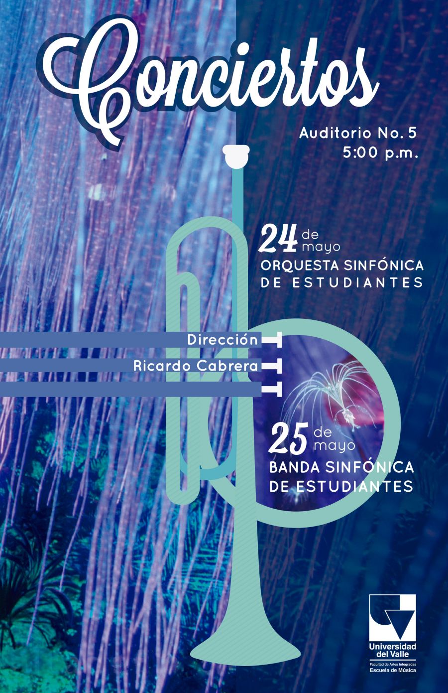 La Escuela de Música de la Universidad del Valle invita a los conciertos de la Orquesta Sinfónica y la Banda de Estudiantes que se realizarán el martes 24 y el miércoles 25 de mayo a las 5:00 p.m. en el auditorio 5 del Campus de Meléndez.