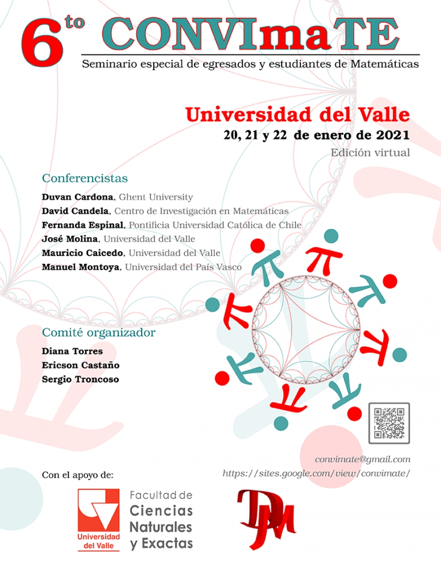 Esta sexta edición tendrá como conferencistas a Duván Cardona (Ghent University), David Candela (Centro de Investigación en Matemáticas), Fernanda Espinal (Pontificia Universidad Católica de Chile), José Molina (Universidad del Valle), Mauricio Caicedo (Universidad del Valle) y Manuel Montoya (Universidad del País Vasco). El comité organizador está conformado por Diana Torres, Ericson Castaño y Sergio Troncoso.