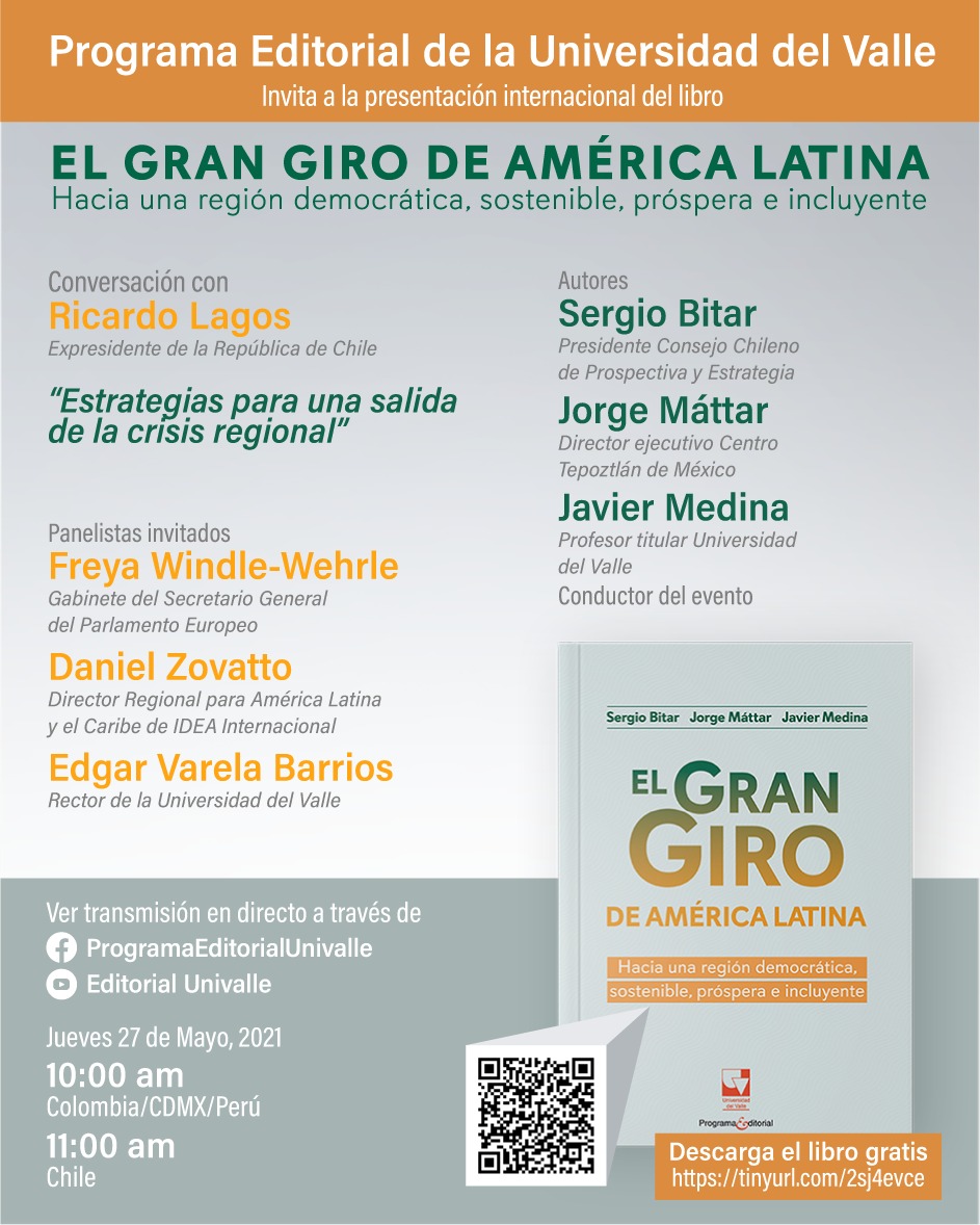 'El Gran Giro de América Latina' es una publicación del Programa Editorial de la Universidad del Valle y tiene detrás una colaboración institucional importante en la que participan el Centro Tepoztlán Víctor L. Urdiqui, reconocido como parte de la dirigencia intelectual de México; el Diálogo Interamericano, institución con sede en Washington que cuenta con una influencia internacional importante sobre la gobernabilidad democrática, la prosperidad y la equidad social en América Latina y el Caribe; el Programa Iberoamericano de Ciencia y Tecnología para el Desarrollo - CYTED, creado por los gobiernos para promover la cooperación en temas de ciencia, tecnología e innovación para el desarrollo armónico de Iberoamérica; y el Consejo Chileno de Prospectiva y Estrategia, que promueve la prospectiva y la estrategia como herramientas para trabajar en la construcción de futuro para ese país.