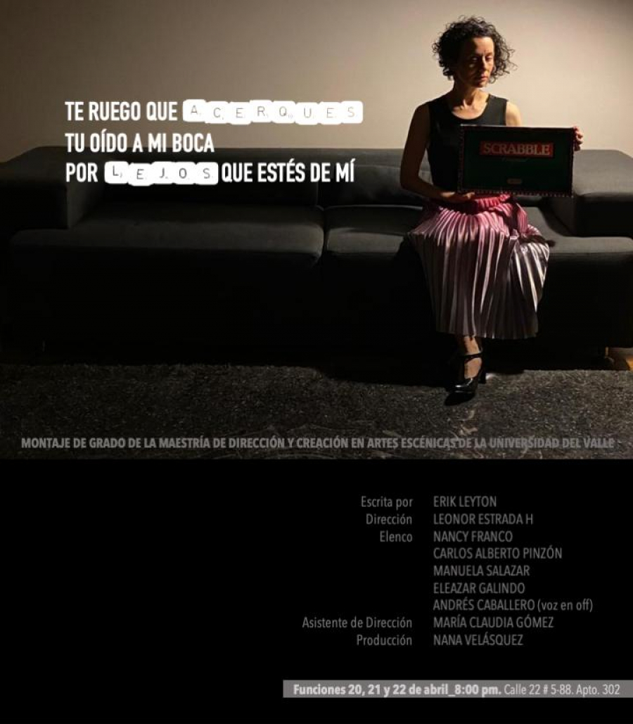 La Maestría en Creación y Dirección Escénica de la Universidad del Valle en Bogotá invita al estreno del trabajo de grado de puesta en escena, "Te ruego que acerques tu oído a mi boca por lejos que estés de mí", del reconocido dramaturgo bogotano Erik Leyton, bajo la dirección de la maestranda Leonor Estrada H.