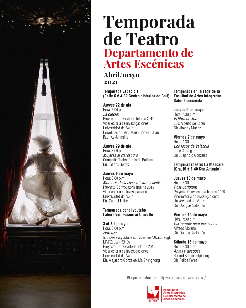 Para mayores informes, reserva de boletería para las funciones en el Teatro La Máscara y Espacio T, así como para gestionar el permiso de ingreso a la sede Meléndez de la Universidad del Valle para las funciones en el Salón Cenicienta, comuníquese con el Departamento de Artes Escénicas:
