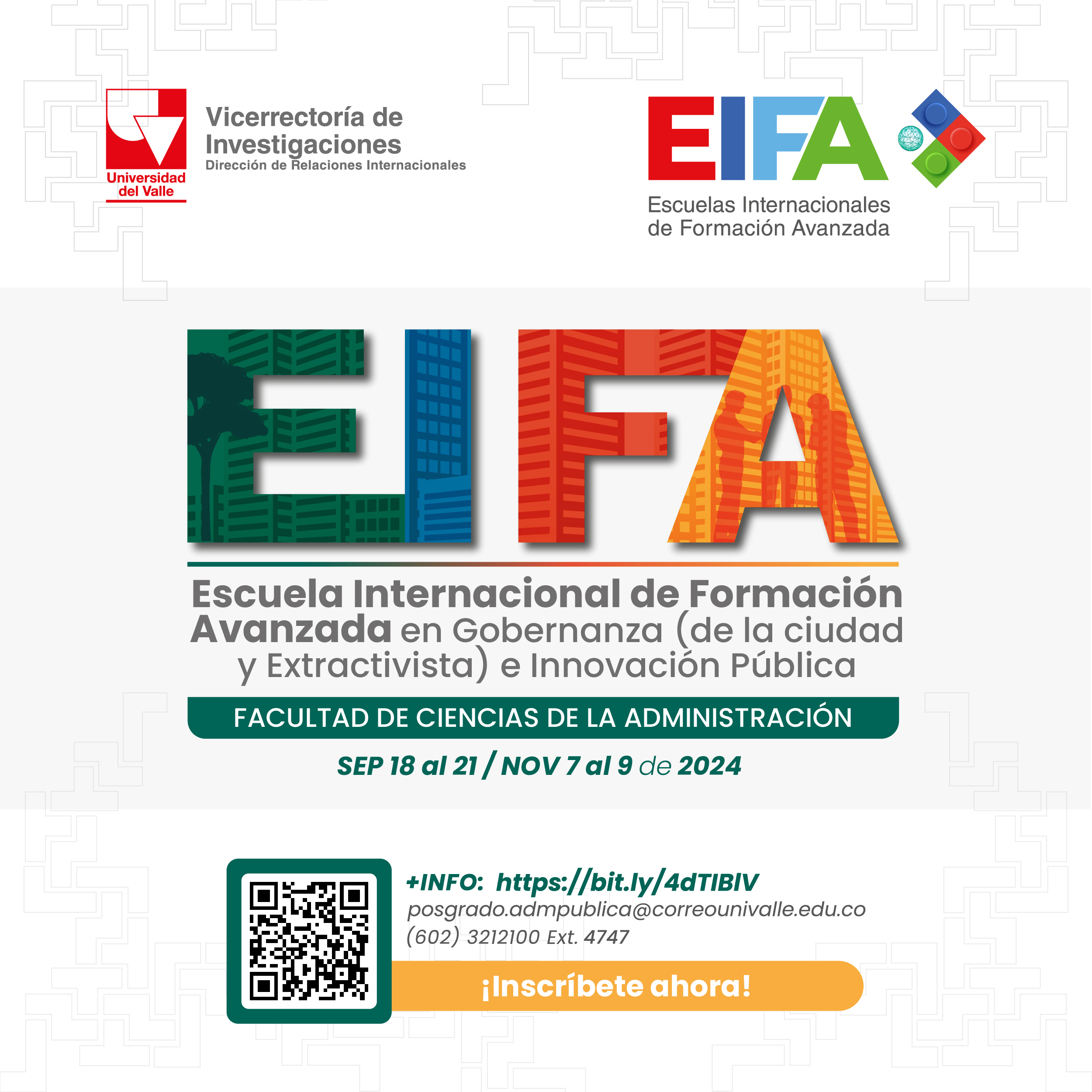 La Facultad de Ciencias de la Administración de la Universidad del Valle y sus programas académicos de pregrado y posgrado en Administración Pública, invita a la comunidad académica y público en general a la Escuela Internacional de Formación Avanzada en Gobernanza (de la ciudad y Extractivista) e Innovación Pública –EIFA 2024. Este evento se llevará a cabo del 18 al 21 de septiembre y del 7 al 9 de noviembre en la Universidad del Valle sede San Fernando.