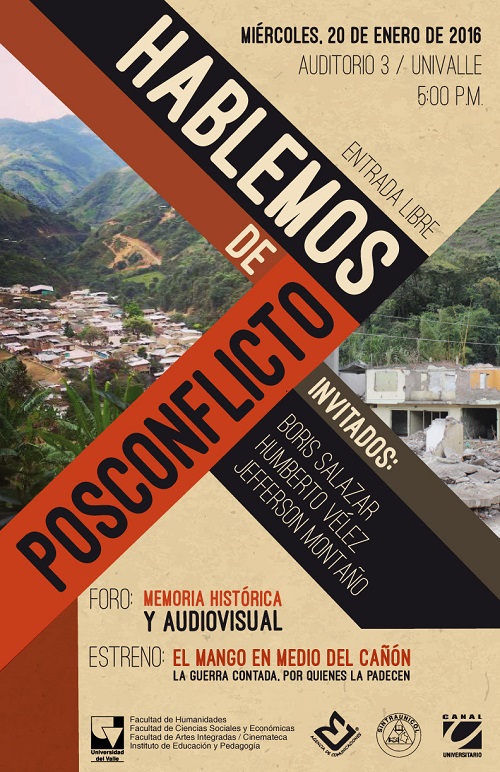 El evento inicia con la proyección del largometraje “El Mango en medio del cañón. La guerra contada por quienes la padecen”, que se pregunta por un hecho histórico en el que, en medio del conflicto armado, la población promovió la salida de la policía del corregimiento de El Mango, en el Municipio de Argelia, Cauca.