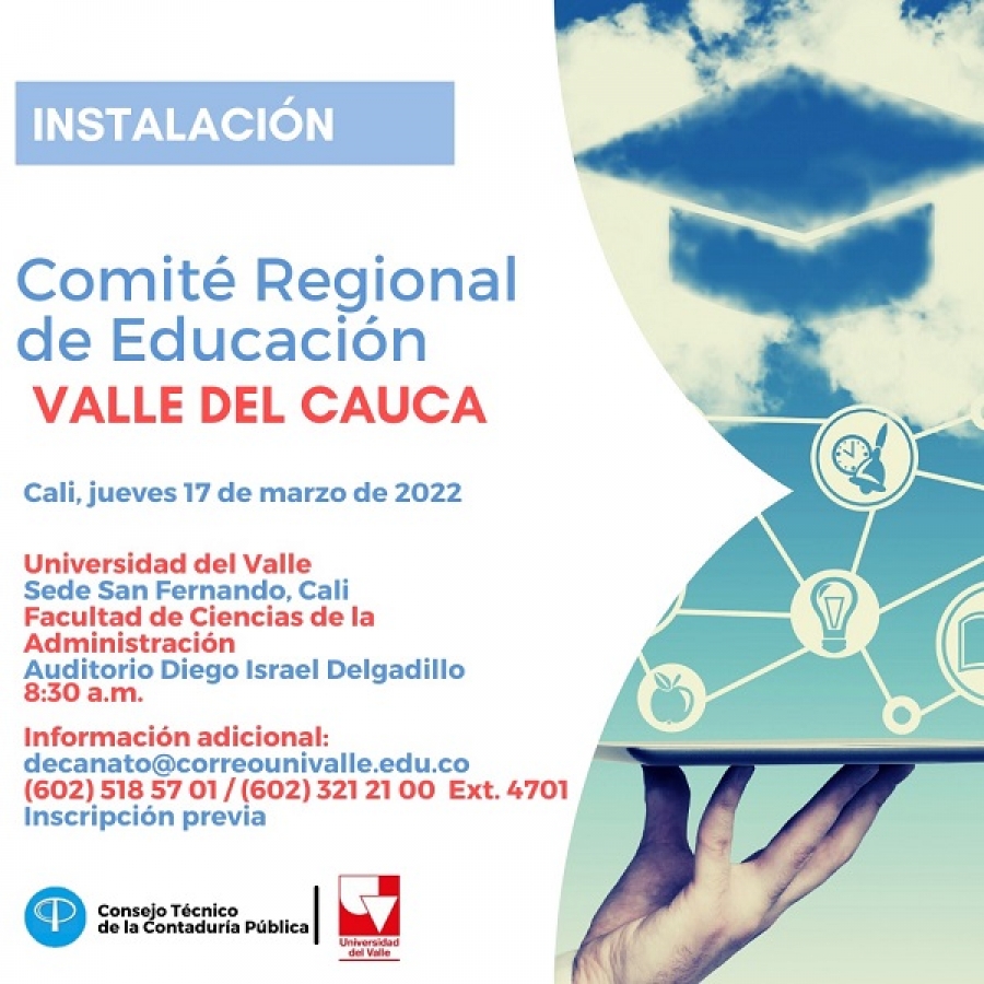 El Consejo Técnico de la Contaduría Pública instalará el jueves 17 de marzo en la ciudad de Cali el Comité Regional de Educación en el Valle del Cauca. El evento tendrá lugar en el auditorio Diego Israel Delgadillo Rodríguez de la Facultad de Ciencias de la Administración, Universidad del Valle Campus San Fernando (Calle 4B N° 36-00) a partir de las 8:30 a.m. y será transmitido a través de la plataforma zoom en el siguiente enlace: https://lobby.sar.ruav.edu.co/#/486BW8DETMQE