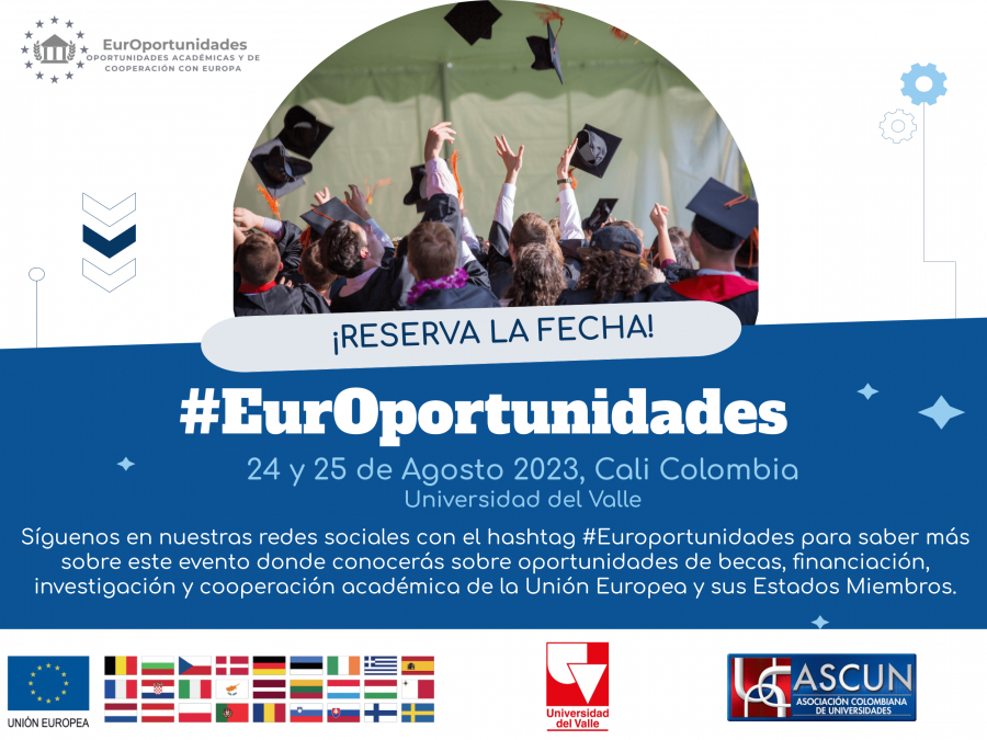 Los próximos 24 y 25 de agosto, en la ciudad de Cali, se realizará la tercera edición de #EurOportunidades 2023, el evento para estudiantes e investigadores/as colombianos/as sobre las oportunidades académicas y de cooperación científica entre Colombia y los países de la Unión Europea.
