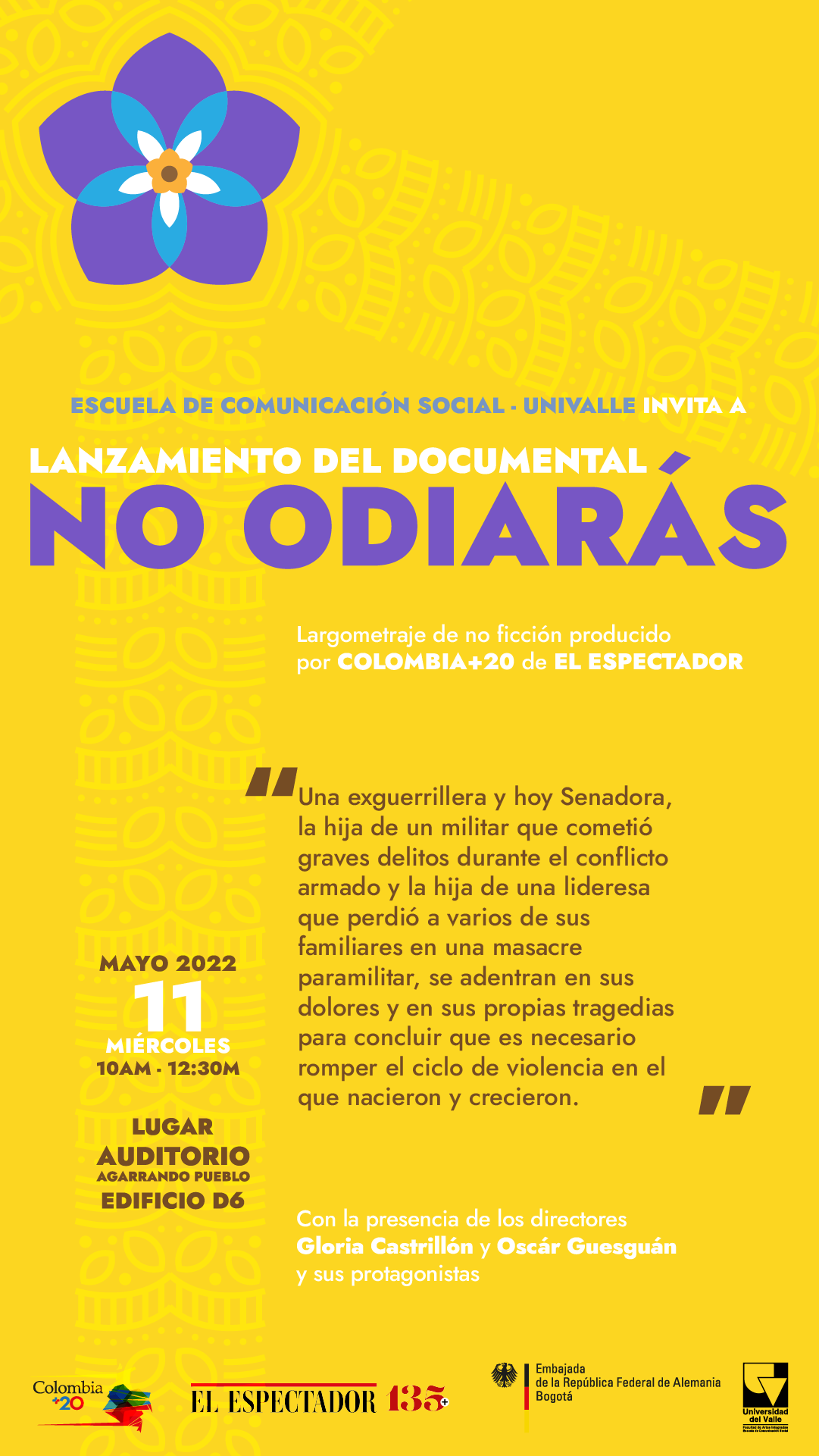 Como preámbulo al evento “Memorias del conflicto, culturas y reconciliación”, la Escuela de Comunicación Social de la Universidad del Valle invita al lanzamiento del documental “No odiarás”, primer largometraje de no ficción producido por Colombia+20 de El Espectador con el apoyo y la financiación de la Embajada de Alemania en Colombia. El evento, que se llevará a cabo el miércoles 11 de mayo en la Sala de Proyecciones del Edificio D6, sede Meléndez, contará con la presencia de sus directores, los periodistas de El Espectador Gloria Castrillón y Oscar Guesguán, así como de algunas de sus protagonistas.