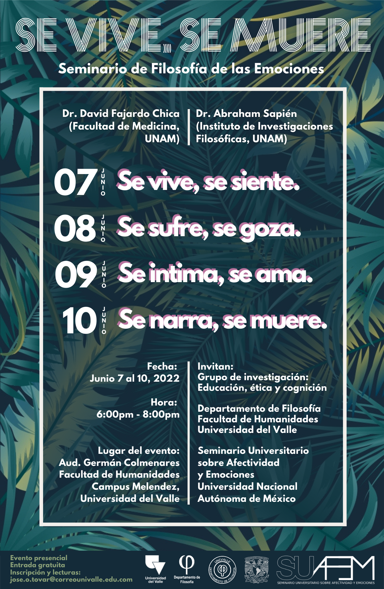 El Departamento de Filosofía de la Universidad del Valle invita a la comunidad vallecaucana a ser parte de ‘Se vive, se muere’, seminario sobre emociones que se dictará la próxima semana, del 07 al 10 de junio, por los doctores David Fajardo Chica (Departamento de Psiquiatría y Salud Mental, UNAM) y Abraham Sapién (Instituto de Investigaciones Filosóficas, UNAM).