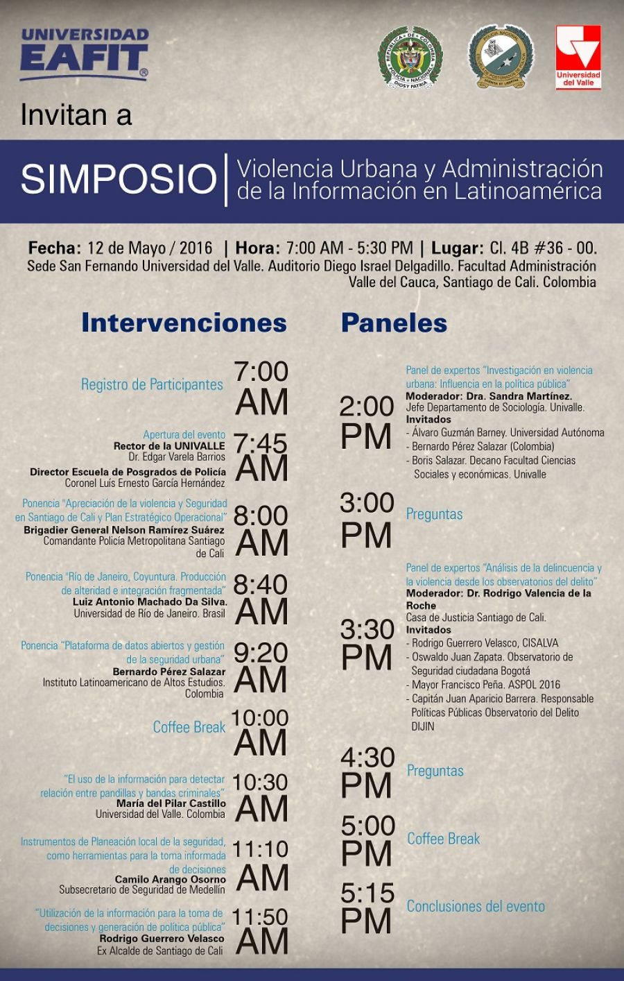 El evento, al que convocan la Universidad del Valle, la Universidad EAFIT y la Escuela de Postgrados de Policía, contará con la apertura del Rector de la Universidad del Valle, Dr. Édgar Varela Barrios y del Director de la Escuela de Posgrados de Policía, Coronel Luis Ernesto García Hernández. En la jornada de la mañana se ofrecerán ponencias de destacados expertos en temas de seguridad urbana y violencia y en la jornada de la tarde habrá dos paneles de expertos con invitados de la academia e instituciones públicas.