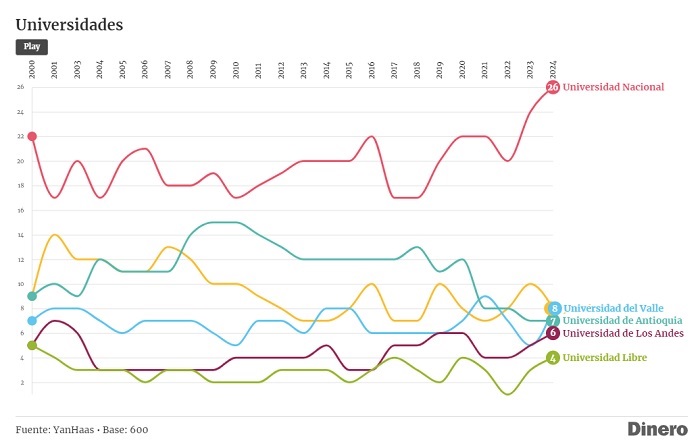 Para el año 2023, el Top of Mind registró en las primeras posiciones a la Universidad Nacional (24), Javeriana (10), Universidad de Antioquia (7), Universidad de Los Andes y Universidad del Valle (5) y la Universidad Libre (3).