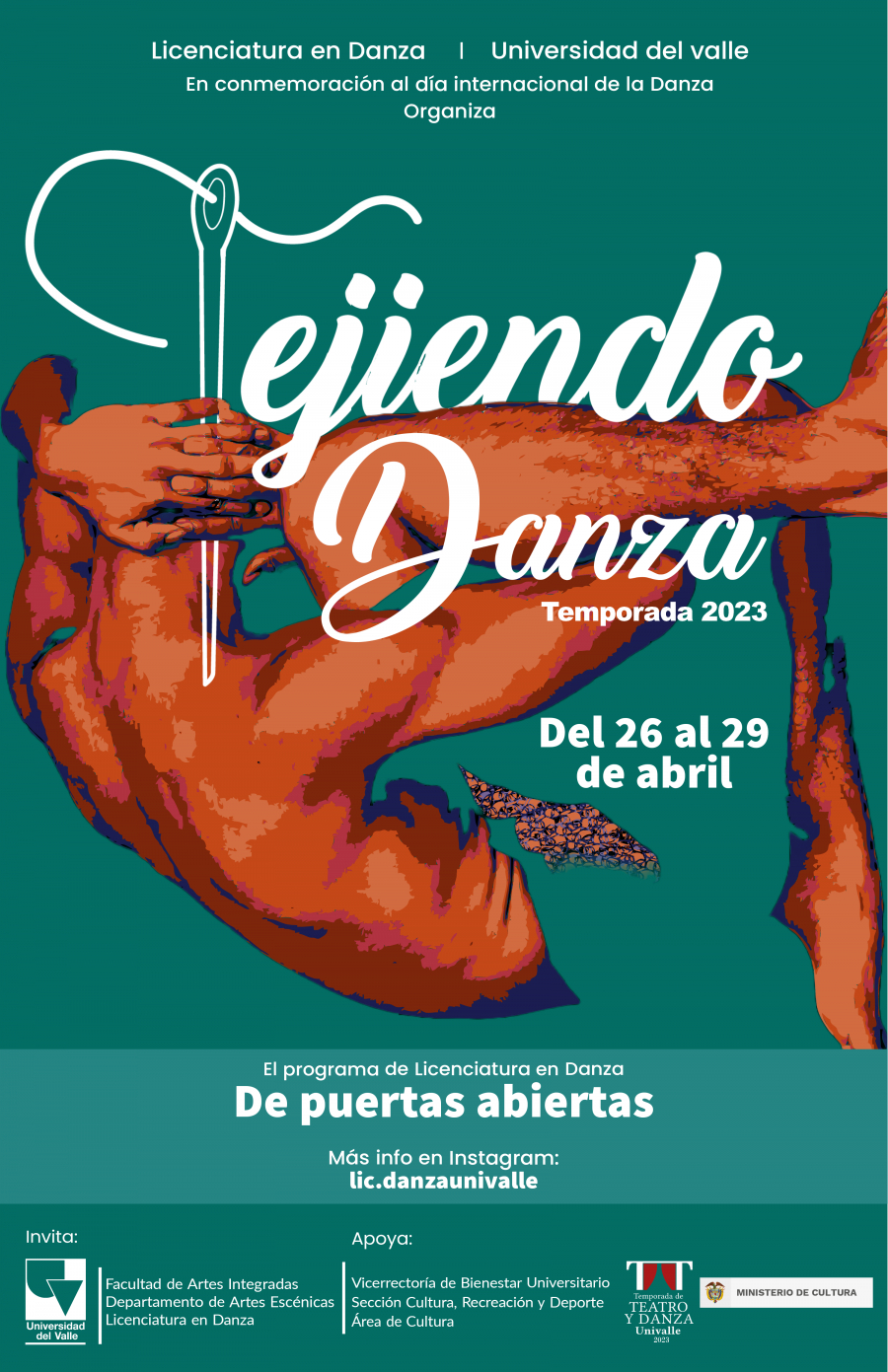 El programa académico de Licenciatura en Danza de la Universidad del Valle te invita a vivir una temporada llena de sorpresas, creatividad y talento. Del 26 al 29 de abril del 2023, el auditorio 4 de la sede Meléndez abrirá sus puertas a toda la ciudad para disfrutar de conversatorios, talleres y obras de danza.