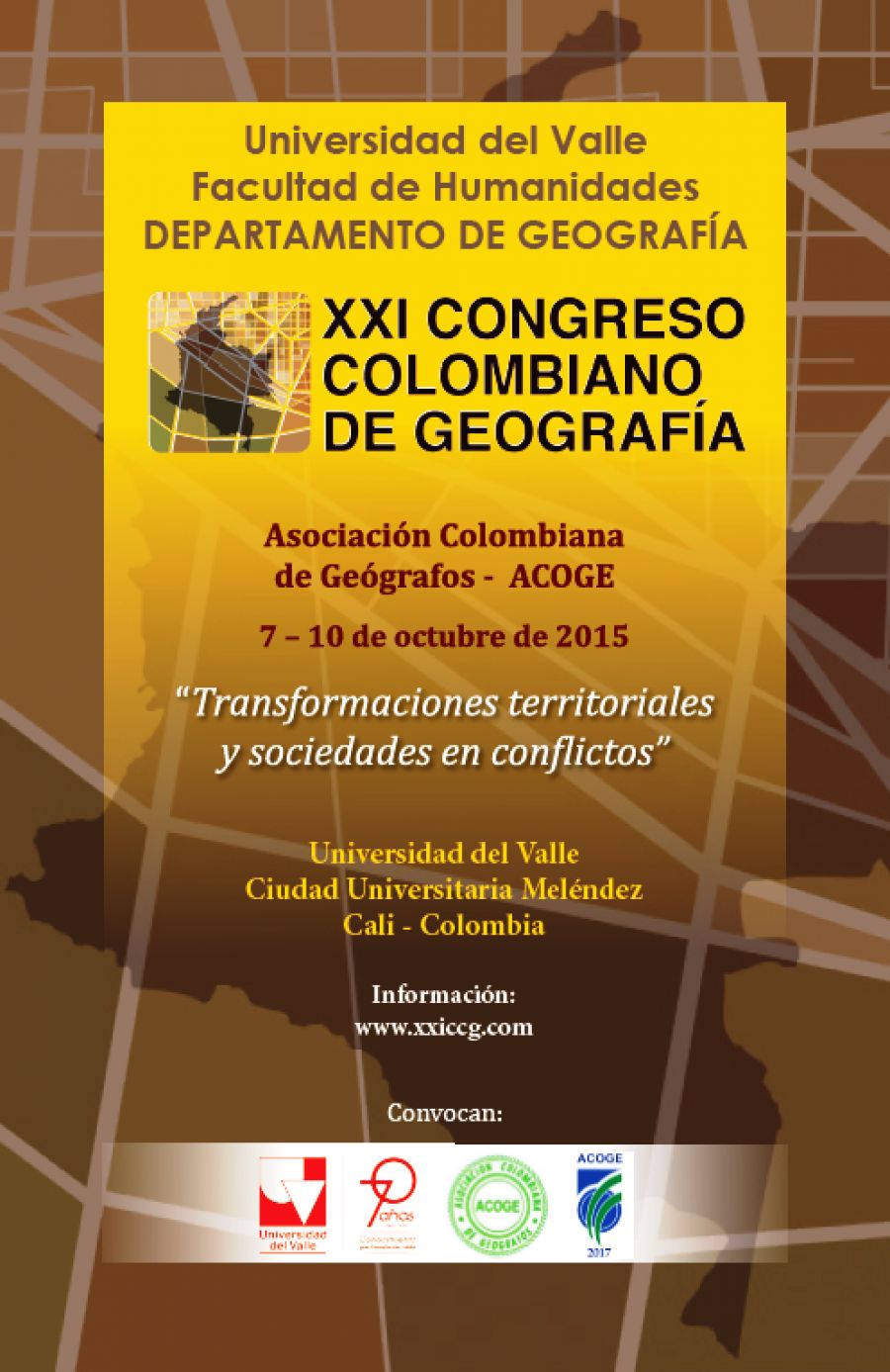El Departamento de Geografía de la Universidad del Valle y la Asociación Colombiana de Geógrafos -ACOGE organizan el XXI Congreso Colombiano de Geografía, del 7 al 10 de Octubre de 2015 en el Campus Meléndez.