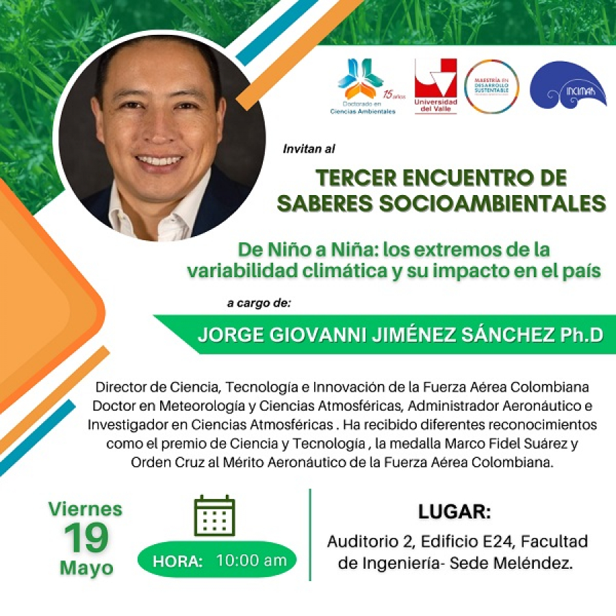 El Doctorado en Ciencias Ambientales, el Instituto de Ciencias del Mar y Limnología y la Maestría en Desarrollo Sustentable de la Universidad del Valle invitan a la conferencia: "De Niño a Niña: los extremos de la variabilidad climática y su impacto en el país", que se llevará a cabo este viernes 19 de mayo, a las 10:00 am., en el Auditorio 2 - Edificio E24, Campus de Meléndez.