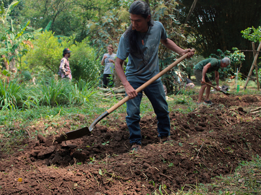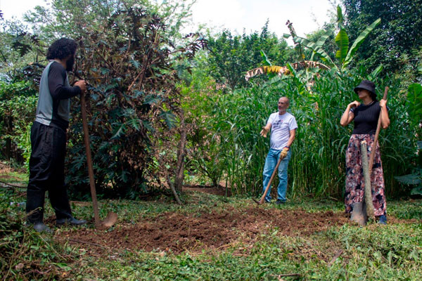 Mateo, Fabio y Angie en la minga de la Huerta Semillas de Libertad