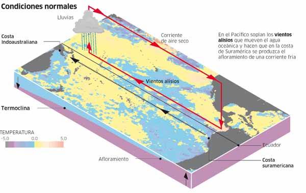 Bajo condiciones normales estas aguas cálidas generan una alta evaporación y el aire cálido y húmedo se eleva generando las lluvias en esa región del globo. Mientras tanto en el Océano Pacífico central y sur oriental se produce un descenso de aire frío y seco, haciendo que esas zonas tengan bajas precipitaciones y facilitando que los vientos fríos que bordean las costas suramericanas condensen la humedad producida en las costas y selvas colombianas, introduciéndolas hacia el continente.