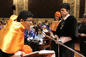 En la imagen, el profesor Álvaro Pío Gómez Olaya, recibe los símbolos de la investidura doctoral (el birrete, el libro de la sabiduría y los guantes blancos) de parte del Rector de la Universidad Complutense de Madrid, Carlos Andradas Heranz. Como madrina ofició la Decana de la Facultad de Ciencias Económicas y Empresariales, María Begoña García Greciano.