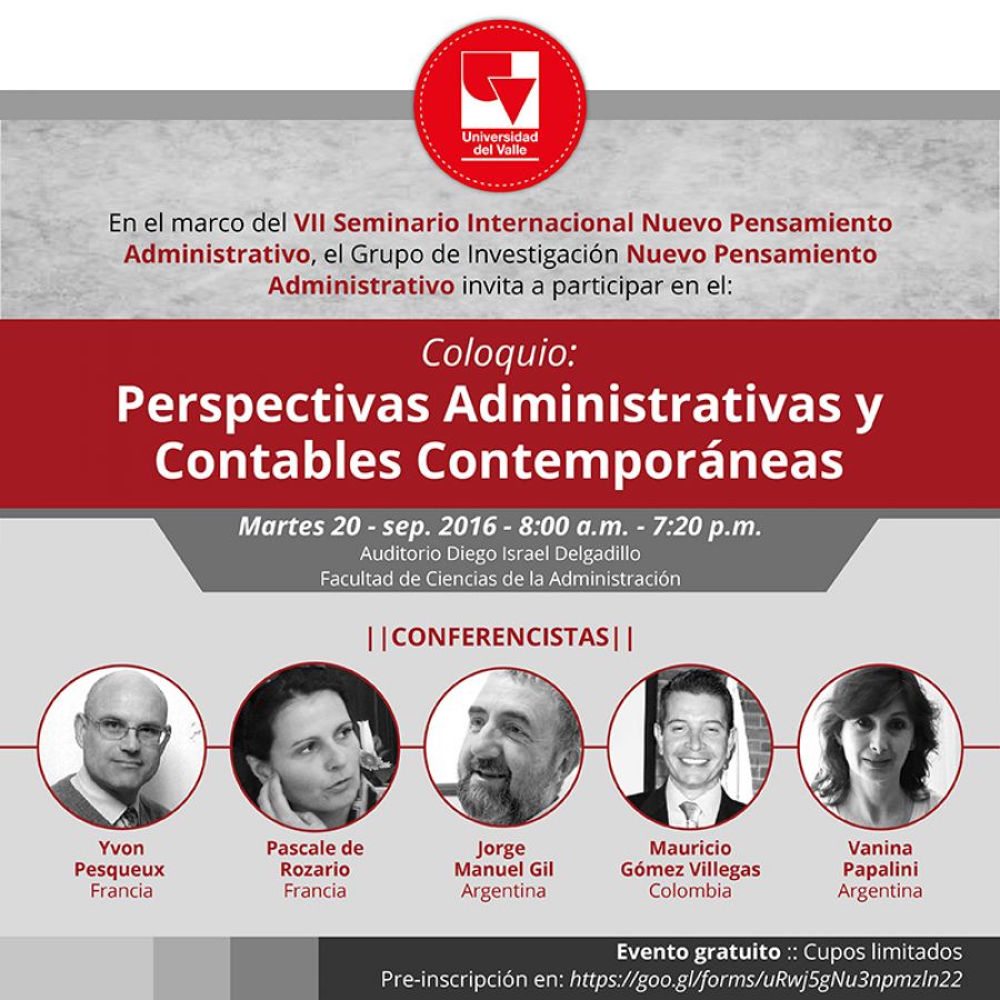 La Facultad de Ciencias de la Administración de la Universidad del Valle invita al Coloquio sobre Perspectivas Administrativas y Contables Contemporáneas, que se realizará el próximo 20 de septiembre, en el Auditorio Diego Israel Delgadillo.
