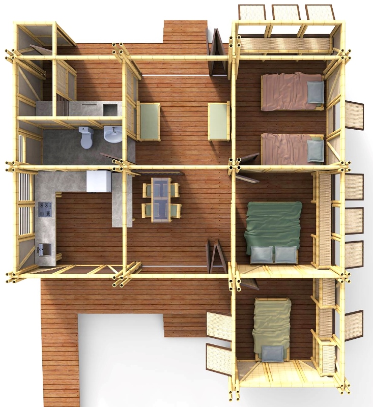 Pero la integración de la casa con el entorno no sólo se da en la espacialidad sino también en la materialidad, ya que la guadua, material principal de la casa, al tener mínimas transformaciones para su uso en la construcción, conserva la relación directa con su origen natural.