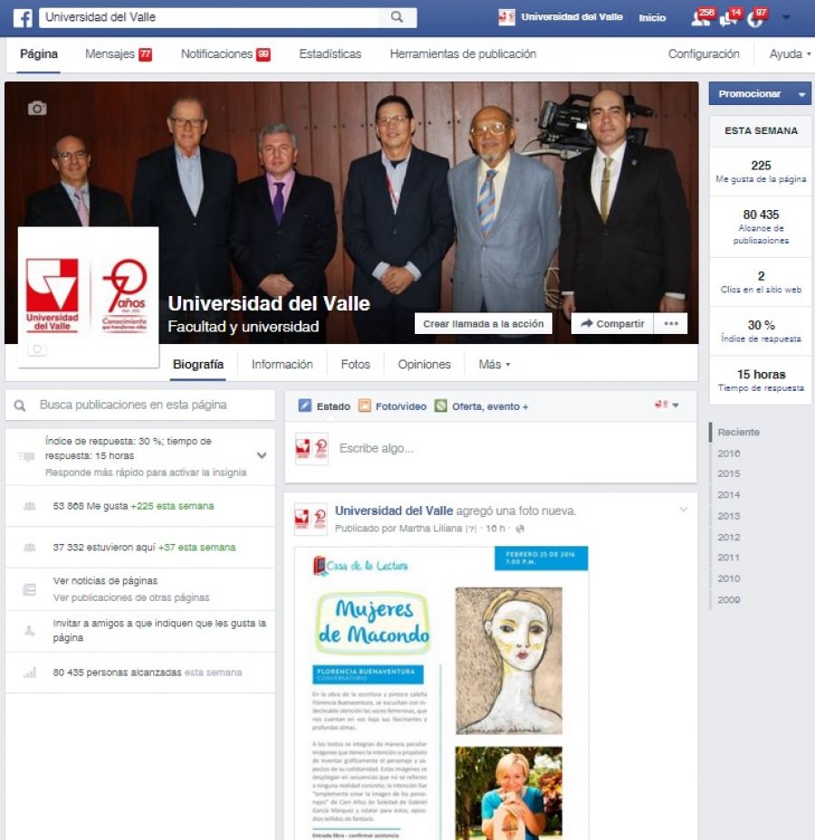 En el lapso comprendido entre el 18 de enero y el 14 de febrero, el fanpage de la Universidad del Valle recibió 1.265 “me gusta” o “likes”. A la fecha los “me gusta” llegaron a 53.777 que ubican el fanpage como el tercero en preferencia en Colombia después de la Nacional y Los Andes. Los momentos pico en los cuales el público manifiesta su gusto por la página son a mediados de mes.