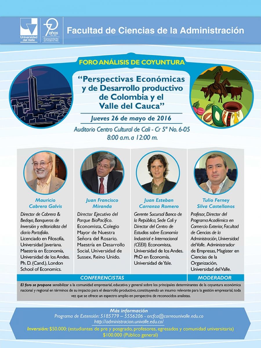 Con el propósito de poner en contexto la compleja situación internacional que afecta al país y al sector empresarial, la Facultad de Ciencias de la Administración de la Universidad del Valle, organiza el Foro Análisis de Coyuntura “Perspectivas Económicas y de Desarrollo Productivo de Colombia y el Valle del Cauca”, este jueves 26 de mayo, a las 8:00 a.m., en el Auditorio del Centro Cultural de Cali.