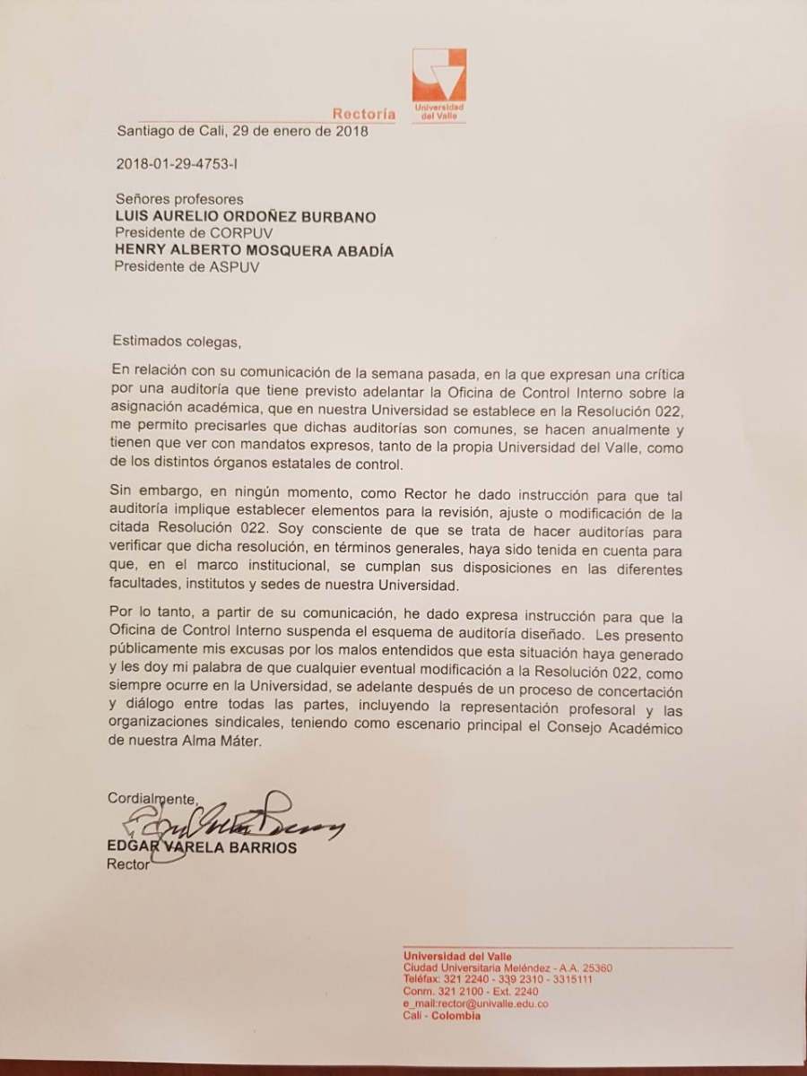 Respuesta del Rector a presidentes de CORPUV y ASPUV