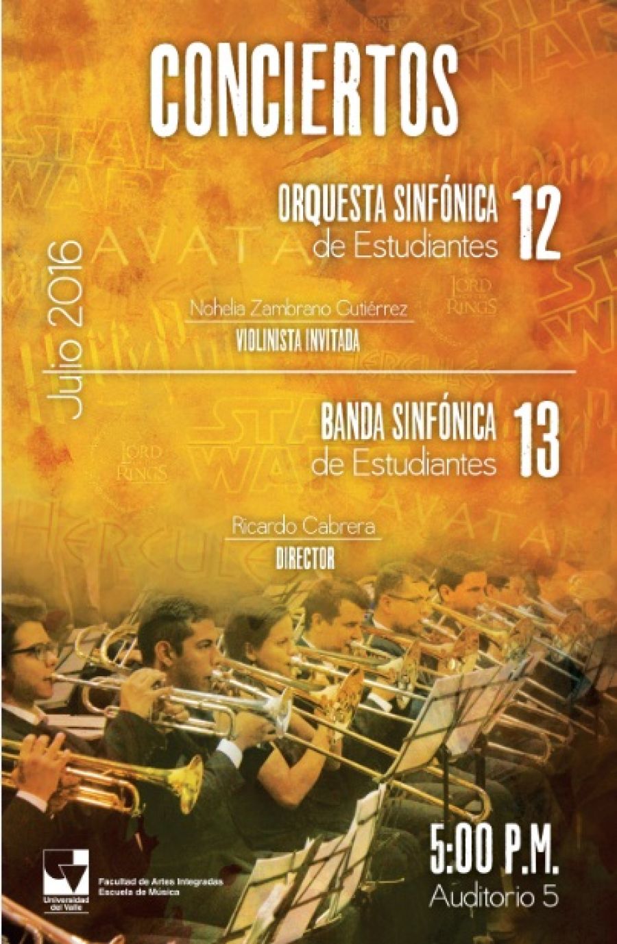 El martes 12 y miércoles 13 de julio serán los conciertos de final de semestre de la Orquesta y de la Banda Sinfónica de Estudiantes de la Escuela de Música dirigidas por el profesor Ricardo Cabrera, a las 5:00 p.m. en el Auditorio 5. Entrada libre.