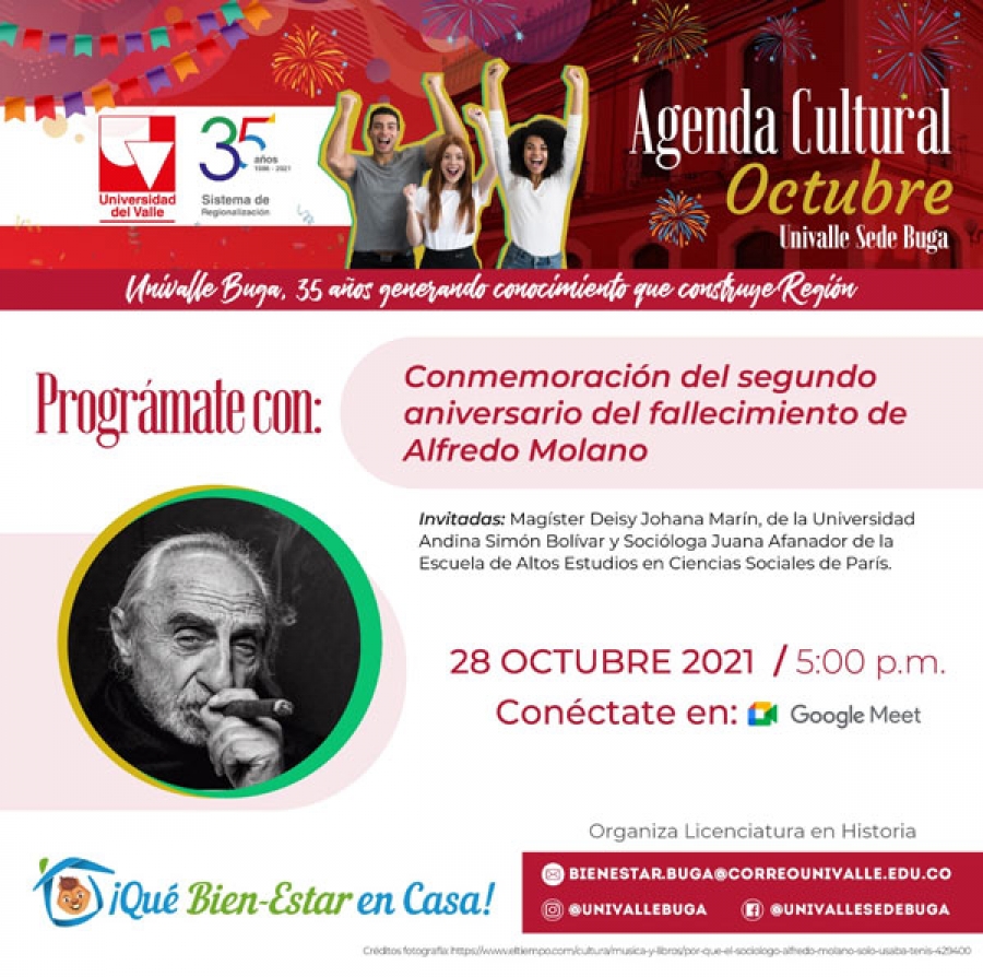 Este jueves 28 de octubre la Licenciatura en Historia de la Sede Buga realizará un evento de Conmemoración del segundo aniversario de la muerte de Alfredo Molano, sociólogo colombiano que recorrió sobre todo el campo colombiano, para presentar el conflicto contando con las voces de sus víctimas. Su aporte cruza fronteras entre la Sociología, la Historia y la Literatura y, por ello, nos parece importante invitarlos a participar en la conmemoración.