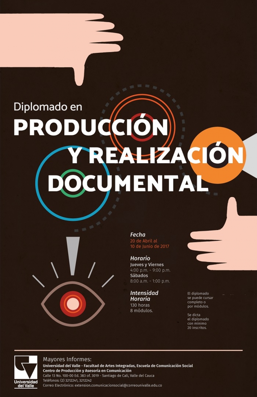 La Escuela de Comunicación Social de la Universidad del Valle abrió las inscripciones para su Diplomado en producción y realización documental, con el objeto de desarrollar un proceso de formación académica en torno a saberes y prácticas propios de la creación audiovisual documental, desde los ámbitos de la investigación, la escritura, la realización, la producción, la fotografía, el sonido, el montaje y la convergencia tecnológica.