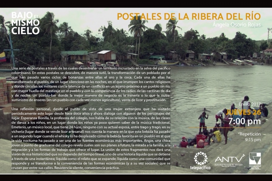 El jueves 26 de enero se presentó el documental 'Postales de la ribera del río', de la realizadora audiovisual y egresada del Programa Académico de Comunicación Social de la Universidad del Valle Ángela Osorio. Esta pieza audiovisual hace parte de la serie documental 'Bajo el mismo cielo', emitida de lunes a viernes de 7.00 p.m. a 7:30 p.m, por el Canal Regional Telepacífico.