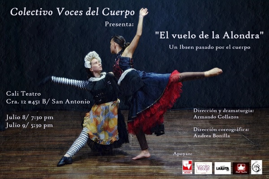 El Colectivo Voces del Cuerpo, grupo de investigación de la Universidad del Valle, presenta la obra 'El vuelo de la alondra, un Ibsen pasado por el cuerpo', bajo la dirección y dramaturgia de Armando Collazos y la dirección coreográfica de Andrea Bonilla, este 8 de julio a las 7.30 p.m. y 9 de julio a las 5.30 p.m. en Cali Teatro en el Barrio San Antonio.