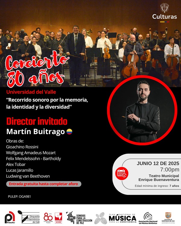 Como parte de las actividades de celebración de los 80 años de fundación de la Universidad del Valle, la Orquesta Filarmónica de Cali se une a esta fecha con un concierto abierto al público. Esta actividad se desarrollará este jueves 12 de junio, a partir de las 7:00 p.m., en el Teatro Municipal Enrique Buenaventura. La entrada es libre hasta completar aforo.