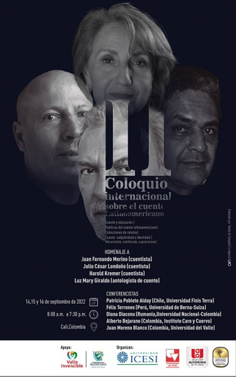 El II Coloquio Internacional sobre el Cuento latinoamericano se compone de conferencias, ponencias, coloquios y homenajes. Los conferencistas son: Patricia Poblete Alday (Universidad de Finis Terra, Chile), Félix Terrones (Universidad de Berna, Suiza), Diana Diaconu (Universidad Nacional), Alberto Bejarano (Instituto Caro y Cuervo) y Juan Moreno Blanco (Universidad del Valle).