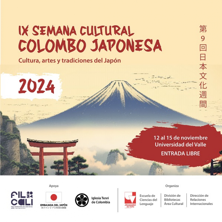 La Universidad del Valle, a través de la Escuela de Ciencias del Lenguaje, la Dirección de Relaciones Internacionales y el Área Cultural de la División de Bibliotecas, con el apoyo de la Embajada del Japón y la Iglesia Tenri de Cali, se complace en invitar a toda la comunidad universitaria y al público en general a la novena edición de la Semana Cultural Colombo Japonesa, que se llevará a cabo del 12 al 15 de noviembre de 2024 en Cali.