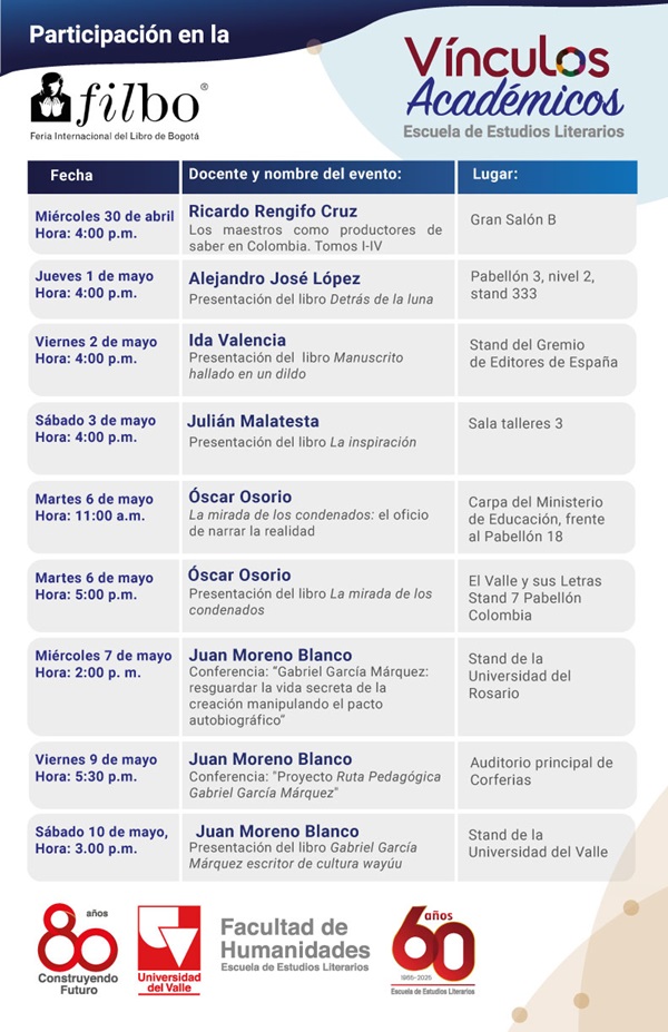 El equipo de docentes de la Escuela de Estudios Literarios de la Universidad del Valle tendrá una destacada participación en la Feria Internacional del Libro de Bogotá 2025.