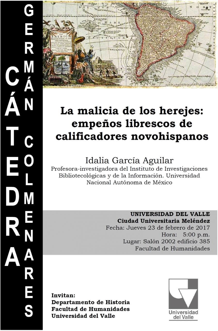 La Cátedra Germán Colmenares y el Departamento de Historia de la Universidad del Valle invitan a la conferencia “La malicia de los herejes: empeños librescos de calificadores novohispanos”, que se realizará este jueves 23 de febrero de 2017, a las 5:00 p.m., Salón 2002, Edificio 385, Facultad de Humanidades.