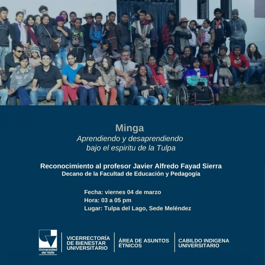 Esta semana tendrá lugar la segunda minga: Aprendiendo y desaprendiendo bajo el espíritu de la tulpa, en este espacio se reconocerá el acompañamiento dado por el decano de la Facultad de Educación y Pedagogía, Javier Alfredo Fayad Sierra, al Cabildo Indigena Universitario. En el evento participarán médicos tradicionales, quienes realizarán una armonización para abrir el camino del profesor en su nuevo cargo como decano, se presentará además una breve memoria audiovisual de su trayectoria con el CIU y se desarrollará un acto simbólico de entrega de diferentes tejidos de los pueblos indígenas como insignia de respaldo y hermanamiento con los procesos de los pueblos. La sesión culminará con un diálogo de saberes y reflexión.