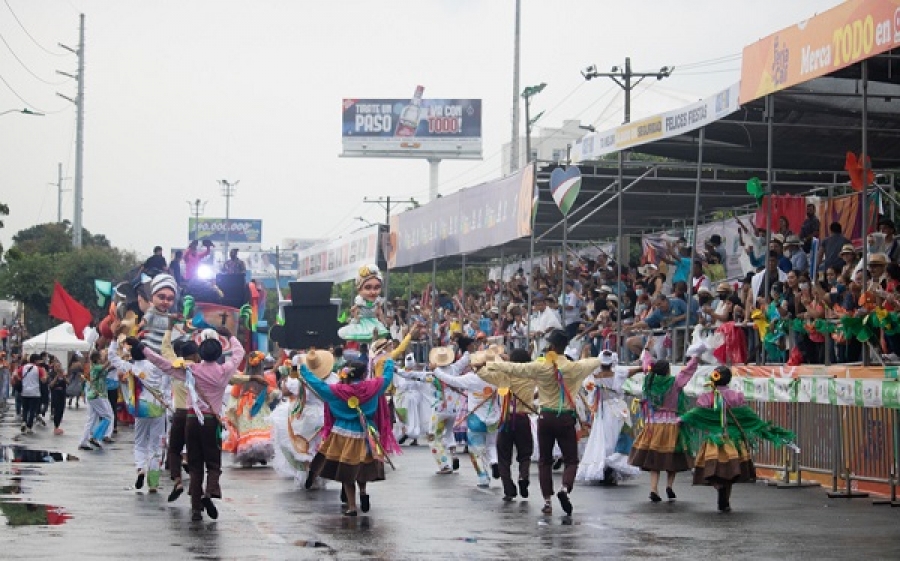 Y así, a pesar de los charcos que había en la vía, de las gotas de lluvia que caían de vez en cuando, el ánimo de los artistas no decayó. Con los zapatos mojados y con algo de frío ellos salieron a darlo todo, a sonreírle a las personas que desde los costados del recorrido, en las tarimas, en las vallas, gritaban a coro el nombre de la institución mientras veían pasar la carroza que transportaba a los músicos, seguidos de los bailarines y sus trajes coloridos.