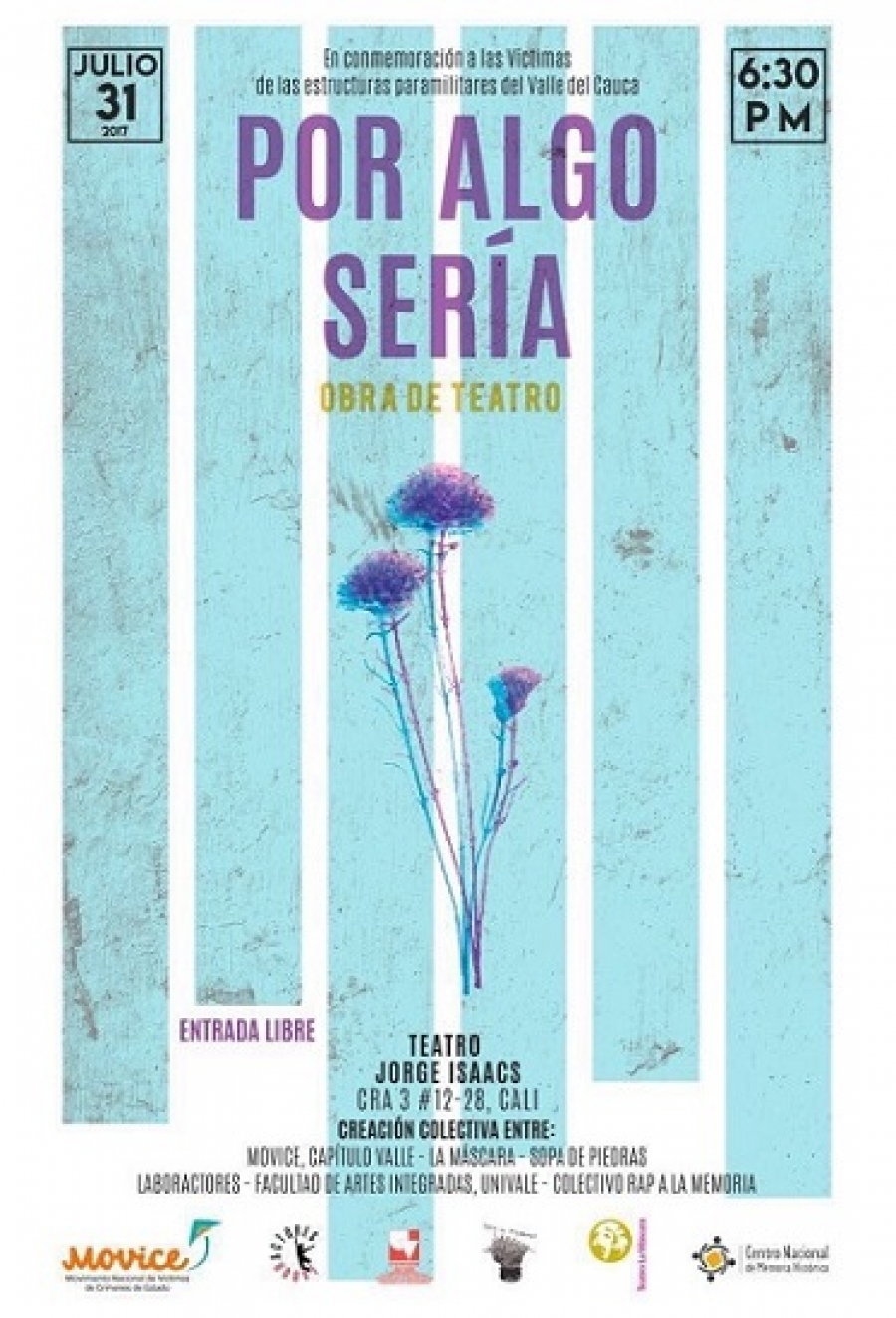 El Centro Nacional de Memoria Histórica, el Movimiento Nacional de Víctimas de Crímenes de Estado (MOVICE), con la participación del Departamento de Artes Escénicas de la Universidad del Valle y otros grupos teatrales representativos de la ciudad presentarán la obra Por algo sería, este lunes 31 de julio, a las 6:30 pm. en el Teatro Jorge Isaacs. La entrada es libre.