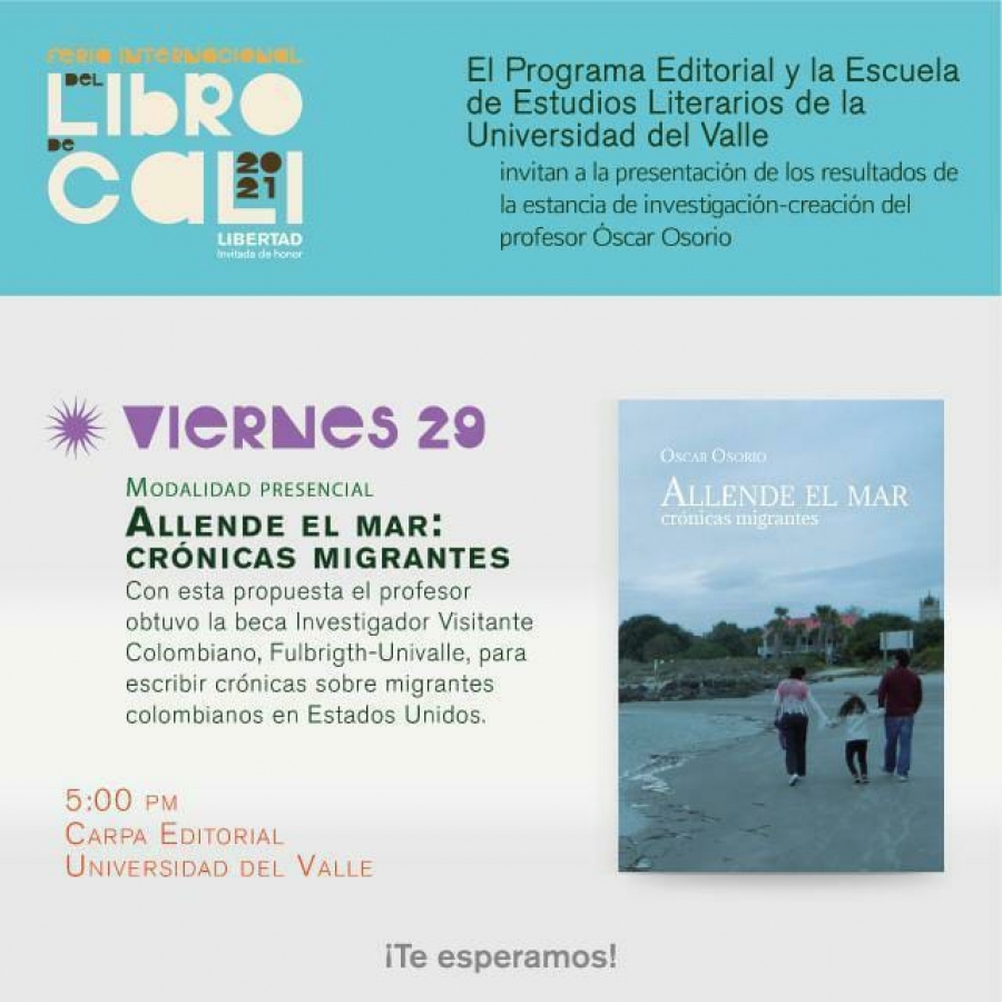 La Escuela de Estudios Literarios de la Universidad del Valle invita a la presentación de los resultados de la estancia de investigación-creación (beca Fulbright) del profesor Óscar Osorio, bajo el título de Allende el mar: Crónicas migrantes, acerca de migrantes colombianos en Estados Unidos.