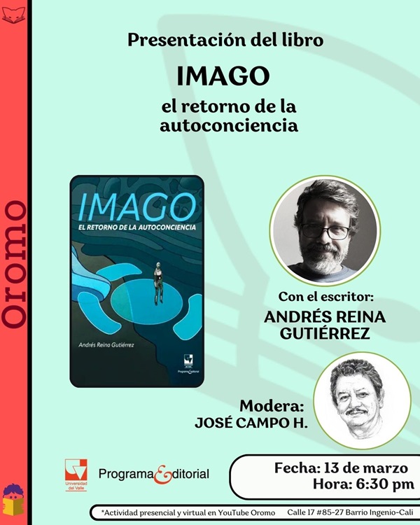 El profesor del Departamento de Diseño Andrés Reina Gutiérrez presenta su novela gráfica Imago, el retorno de la autoconciencia, publicada por el Programa Editorial de la Universidad del Valle, este viernes 13 de marzo de 2026, a las 6:30 p.m., en la Librería Oromo (Calle 17 #85-27 Barrio El Ingenio, Cali).